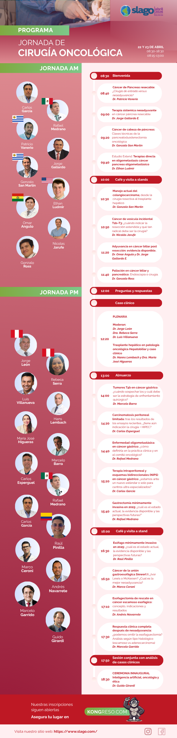 Este encuentro se desarrollará en un marco de diálogo multidisciplinario, con la participación de destacados exponentes de la Oncología y la Cirugía Digestiva de Latinoamérica, favoreciendo el intercambio de experiencias y visiones que enriquecen nuestra práctica clínica diaria.